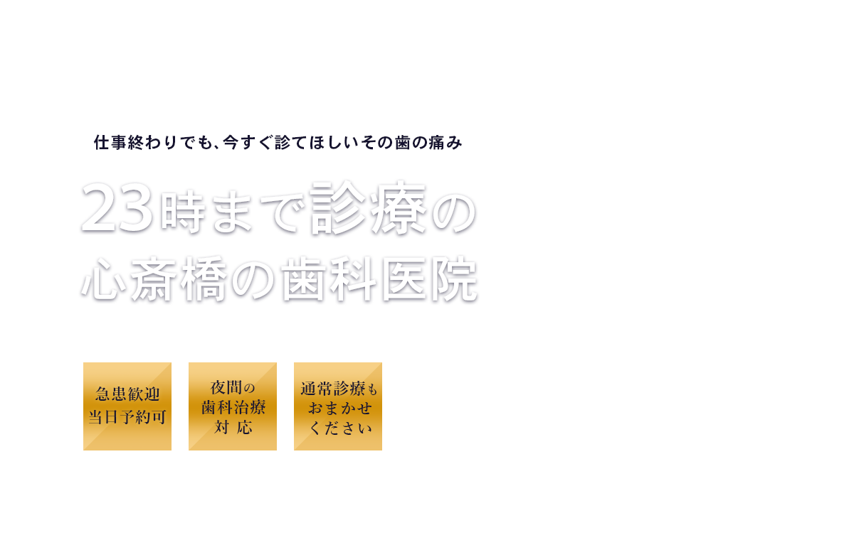 虫歯による痛みやしみる症状、詰め物・被せ物のトラブルなど、一般歯科を中心に夜間でも診療を行っています。「夜だから診てもらえないかも…」と迷う前に、まずはご相談ください。